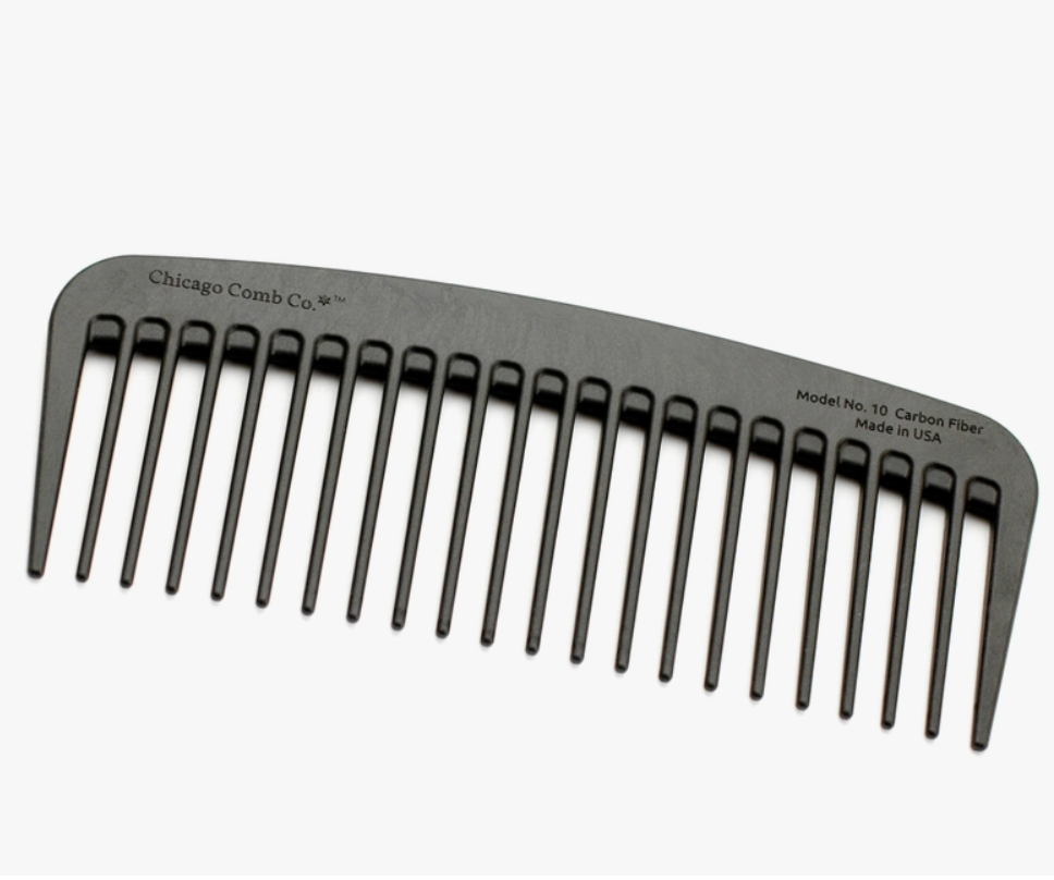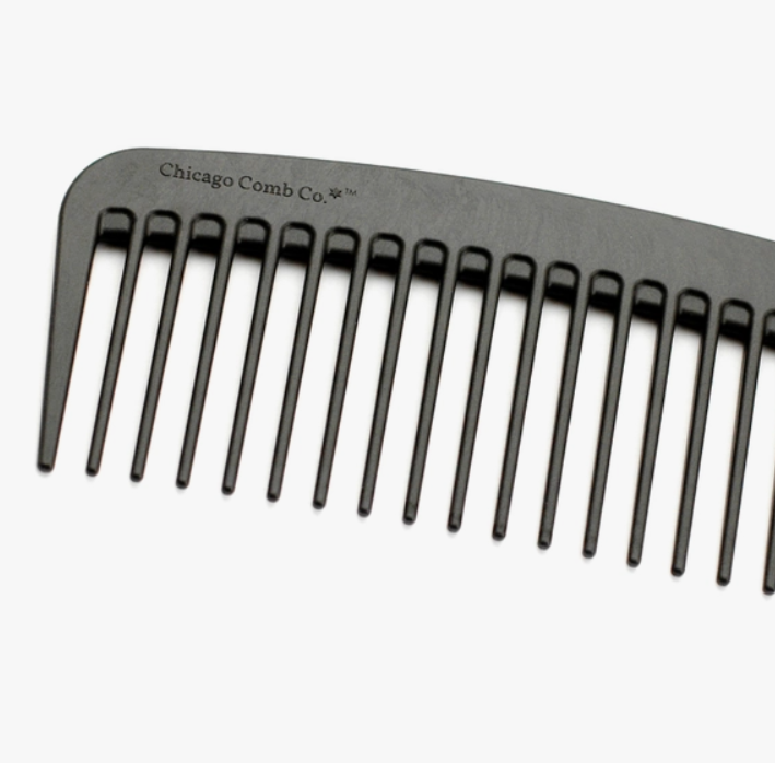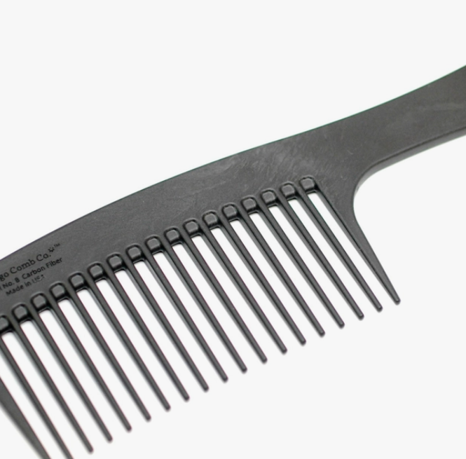 Chicago Comb Co. combs are crafted from a high-quality carbon fiber composite, which offers an ultra-smooth, strong, and lightweight feel. Say goodbye to unpleasant "static shocks" as carbon fiber combs are naturally anti-static. They are also heat and chemical-resistant, making them exceptionally durable. You can even leave them in the shower without worrying about warping.