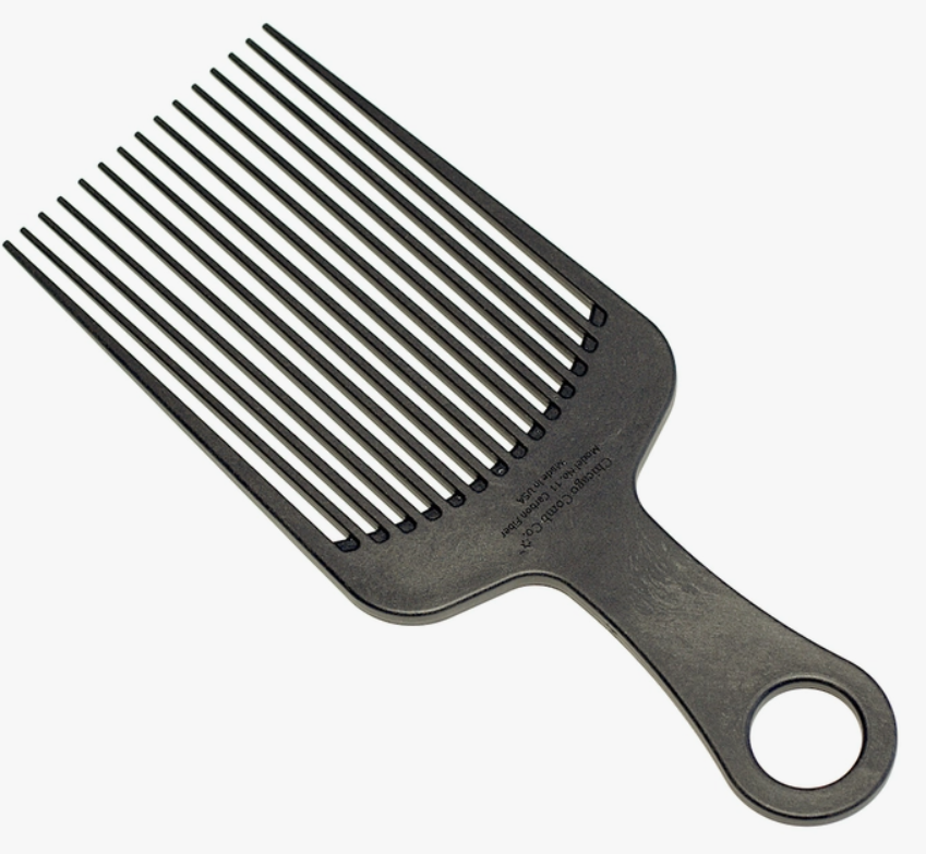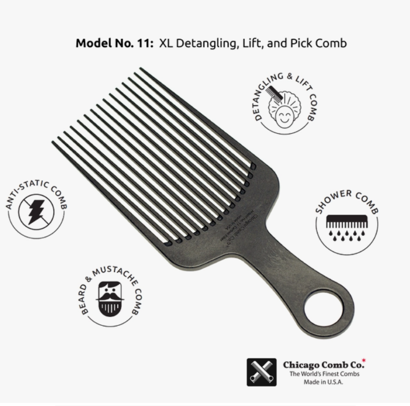 The Chicago Comb Model No 11 is the ultimate XL detangling, styling, and pick comb. With a long handle and extra-long tines, it's perfect for long, curly, natural hair, afro styles, pompadours, and big beards. It effortlessly glides through hair while providing easy detangling. The round opening at the top allows for easy hanging or holding of the comb. This comb delivers unmatched performance with a height of 7.5 inches and a width of 3 inches.
