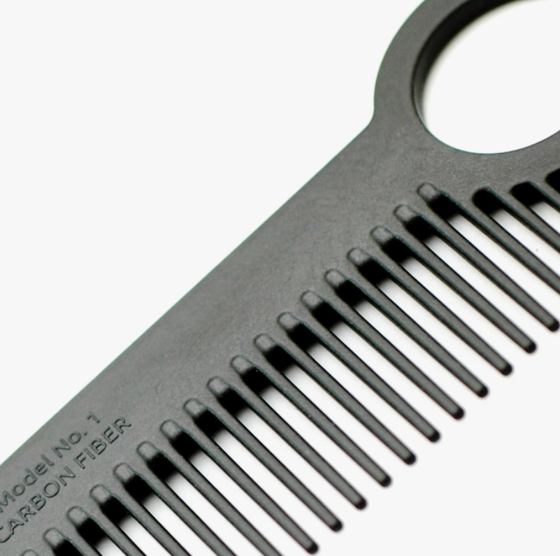 The Model No 1 Carbon Fiber Comb is truly unique with its patented design featuring a convenient loop at one end, allowing you to hold or hang it effortlessly. With medium-fine teeth, it's the perfect comb for everyday use, easily fitting into your pocket or travel bag.